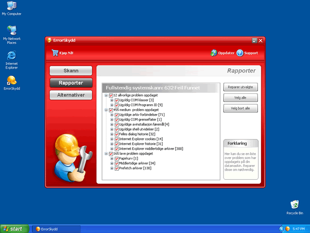 ErrorSkydd is a corrupt anti-spyware application. ErrorSkydd is usually downloaded and installed onto your machine by a Trojan, infiltrating your system through exploits in the browser security system. As soon as ErrorSkydd is installed, it will display exaggerated reports of virus threats that can only be removed by the “full version” of ErrorSkydd. Such malicious actions will only slow down your system severely. ErrorSkydd is a fraud and, therefore, it is strongly recommended to remove this parasite from your system upon detection.