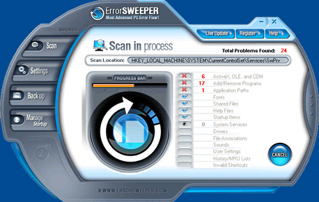 ErrorSweeper is a corrupt registry cleaner program that may be secretly downloaded and installed by a Trojan, through browser security holes, or via other illegal delivery methods. Once inside your system, ErrorSweeper will display false messages and exaggerated system errors in an effort to goad you into buying the full version of ErrorSweeper. ErrorSweeper is reported to be a clone of RegClean.