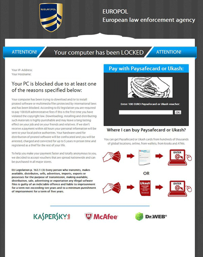 Europol Ransomware displays its screen-wide fake alert, which is a borderless browser window, as soon as your PC restarts. This alert claims that your computer is suffering from a lawful lockdown due to file distribution-related crimes and even threatens you with five years in prison if you don't pay its fine. However, the method that Europol Ransomware prefers for payment, Ukash or Paysafecard, both are well-known services that are exploited by ransomware-based malware, and SpywareRemove.com malware researchers can't think of any legal reason for being required to pay this illegal fine (no matter what you may or may not have been doing on your computer).