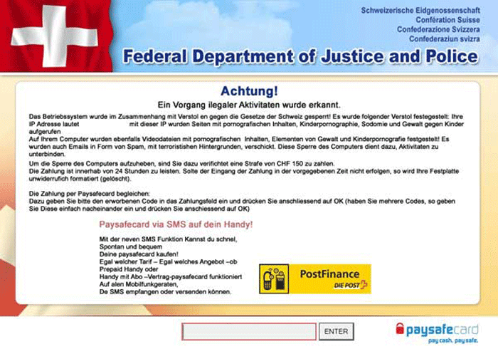 | 1 | Federal Department of Justice and Police Achtung! Ein Vorgang ilegaler Aktivitaten erkannt! Das Betriebssystem wurde im Zusammenhang mit Verstossen gegen die Gesetze der Bundesrepublik Deutschland gesperrt! Es wurde folgender Verstoss festgestellt: Ihre IP-Adresse lautet: “” mit dieser IP wurden Seiten mit pornografischen Inhalt, Kinderpornographie, Sodomie und Gewalt gegen Kinder aufgerufen. Auf Ihrem Computer wurden ebenfalls Videodateien mit pornografischen Inhalt, Elementen von Gewalt und Kinderpornografie festgestellt. Es wurden auch Emails in Form von Spam, mit terrroristischen Inhalten, verschickt. Diese Sperre dient dazu, Ihre illegalen Akticitäten zu unterbinden. |
