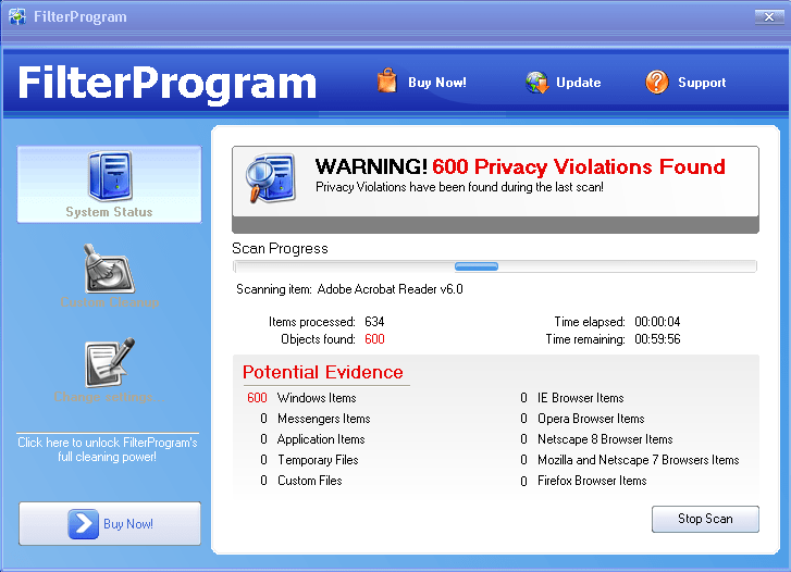 FilterProgram is a rogue PC cleanup utility usually downloaded and installed by a Trojan or through browser loopholes. Once stealthily installed, FilterProgram will generate false alerts regarding your computer security. These alerts may look similar to Windows Security center notifications, however they shouldn’t be trusted. The makers of FilterProgram seek to make you purchase the full version of FilterProgram. FilterProgram may appear extremely difficult to manually remove.