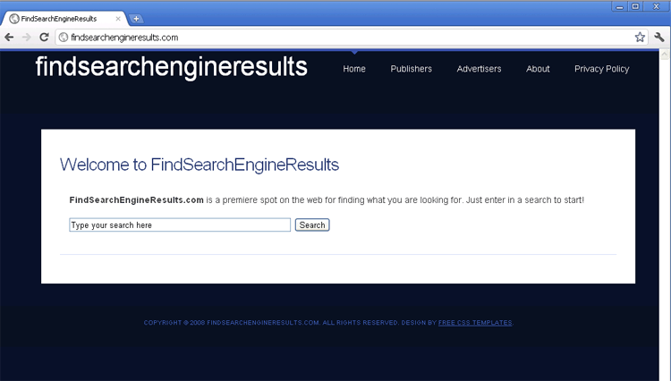 Although FindSearchEngineResults.com's marketing proudly proclaims FindSearchEngineResults.com to be a 'premiere spot' for finding what you're looking for online, FindSearchEngineResults.com offers, at best, shaky search features and sponsored links instead of real links to relevant results. This shouldn't be a surprise to persons who are familiar with FindSearchEngineResults.com's tagline, which indicates that FindSearchEngineResults.com is a flat-out clone of other questionable search sites like Find-fast-answers.com, Expandsearchanswers.com, Quick-search-results.com and Search-fast-results.com. Since FindSearchEngineResults.com's value as a search engine is extremely questionable, it's recommended that you try to avoid significant interaction with FindSearchEngineResults.com, although, so far, FindSearchEngineResults.com hasn't been reported to use drive-by-downloads or other types of direct attacks against visitors' web browsers.