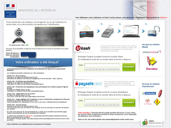 The France Ministère de l'Intérieur Virus is a pop-up alert that's created by a variant of the Reveton Trojan or (as it's referred to casually) the Ukash Virus. Like the similar but less visually sophisticated Votre ordinateur est bloqué Gendarmerie Ransomware, the France Ministère de l'Intérieur Virus displays a fake pop-up that claims that your computer has been locked by the government of France due to your illegal activities. The truth is that the France Ministère de l'Intérieur Virus isn't related to any type of police or government and doesn't have any goal except to extort money through Ukash or Paysafecard. While the France Ministère de l'Intérieur Virus cites various legal sources to make victims give away their money in a blind panic, SpywareRemove.com malware researchers recommend that you ignore the France Ministère de l'Intérieur Virus's warnings and use anti-malware programs to delete the France Ministère de l'Intérieur Virus, just like any other variant of a Reveton Trojan.