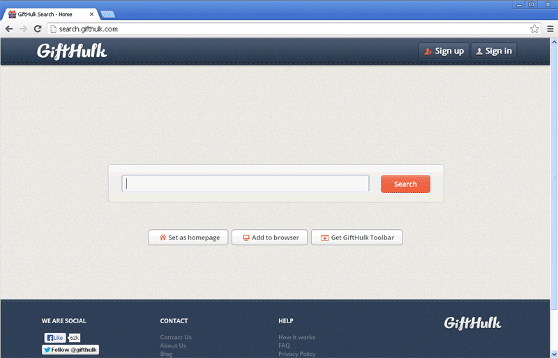 The GiftHulk Virus is associated with a site that offers free monetary compensation merely for doing what you always do on the Internet – social network, shop and use search engines. SpywareRemove.com malware researchers haven't seen any clear indications of fraud in this suspicious business model, but do note that Gifthulk.com has been known to abuse e-mail invitation protocols by spamming mass-mailed messages arbitrarily. Nonetheless, the most significant danger related to Gifthulk.com is the confirmed presence of at least one form of GiftHulk Virus, which functions as a browser hijacker that redirects your searches to a search engine sub-domain of Gifthulk.com.