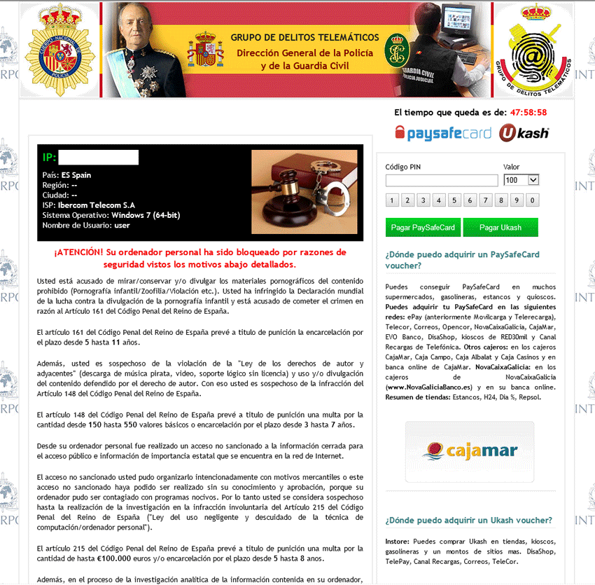 The language of the Guardia Civil Ransomware's current pop-up attack is specialized for Spanish victims, as are its legal references to the Guardia Civil and other institutions of the Spanish government. Malware researchers estimate that the Guardia Civil Ransomware is detecting appropriate victims through their IP addresses, although the Guardia Civil Ransomware also may be being delivered by download attacks that are targeting Spain specifically (such as some types of e-mail spam).