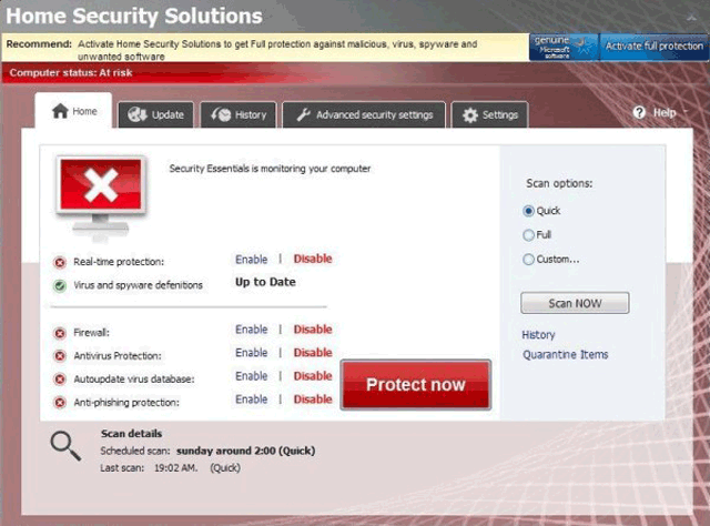 Home Security Solutions is a fraudulent anti-malware scanner that detects nonexistent spyware in-between making requests for money to remove said infections. Purchasing Home Security Solutions is entirely-unnecessary for the well-being of your PC, and SpywareRemove.com malware experts instead recommend that you remove Home Security Solutions with a legitimately-functional anti-malware program. Because Home Security Solutions may attempt to block your PC security software under the pretense that these programs are infected or otherwise damaged, you should try to disable Home Security Solutions before you delete it; Safe Mode or equivalently-secure methods of accessing your OS are recommended.