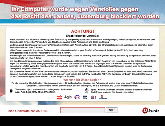 Contrary to what its pop-up warning claims, 'Ihr Computer Wurde Blockiert' Ransomware doesn't have any affiliation with Luxembourg's law enforcement and isn't able to detect crimes that you may (or may not) have used your PC to commit. Although 'Ihr Computer Wurde Blockiert' Ransomware targets the nation of Luxembourg, SpywareRemove.com malware researchers have seen related ransomware Trojans attacking other countries through Europe – and even Canada.
