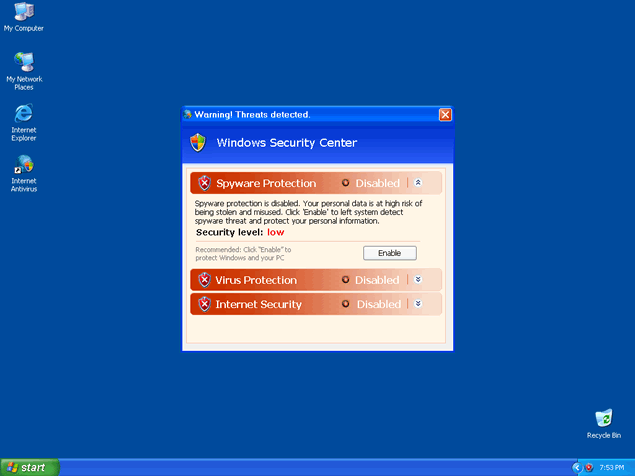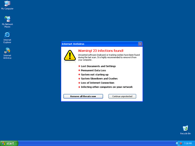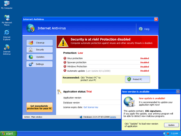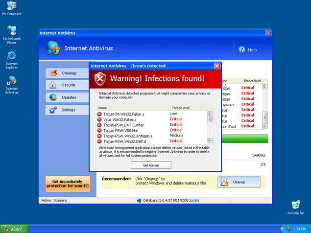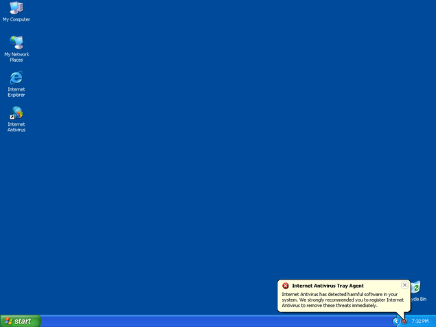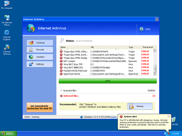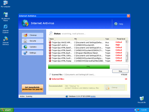 Internet Antivirus, also known as IA or InternetAntivirus, is a rogue anti-spyware program that installs in your computer system with the help of Trojan Zlob or other malicious methods. You may have also downloaded Internet Antivirus from a rogue website thinking it would remove your spyware threats. Once Internet Antivirus' trial version is installed, it will run a fake system scan to generate a list of spyware results that are supposedly found in your system. Along with this scan, popups and fake system alert messages may appear to "inform" you about your supposed infections.