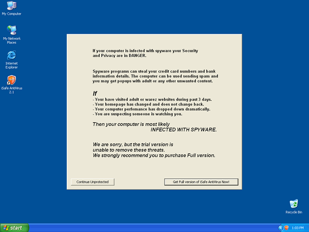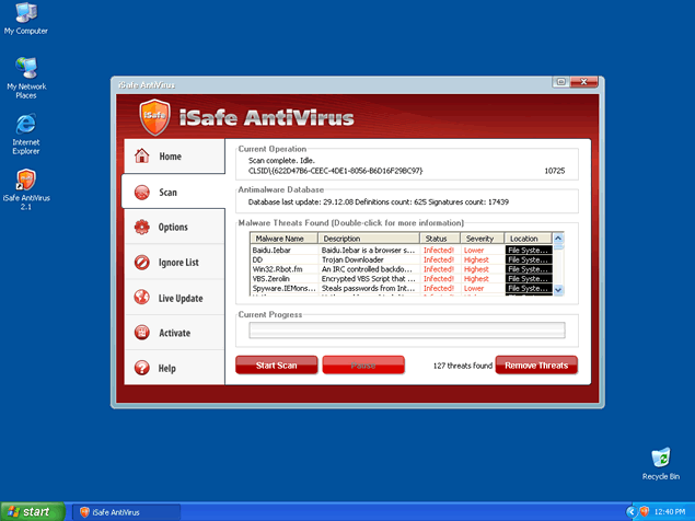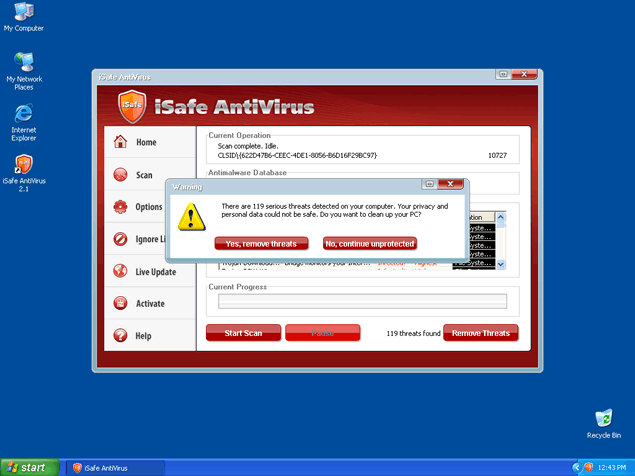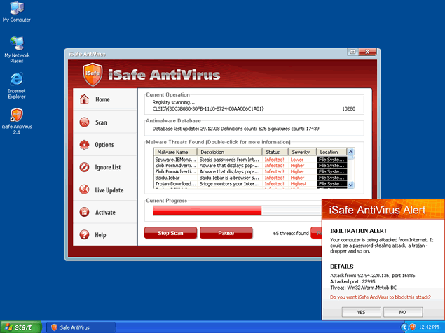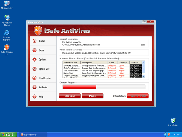 iSafe Antivirus will attempt to get computer users to purchase a full version through many deceiving methods. iSafe Antivirus may create an unsafe environment for using your computer over the internet. It is important to detect iSafe Antivirus with a spyware scan tool so that all of the related iSafe Antivirus files may be removed. iSafeAntivirus is not a legitimate program for removal of spyware or securing your computer. Do not ever waste your time installing or purchasing the iSafe Antivirus program. iSafe Antivirus may be very difficult to manually remove in many cases.