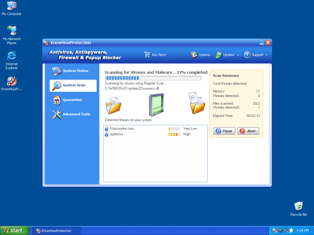KnowHowProtection is a rogue antispyware application that promises to detect, remove and protect your PC from thousands of potential malicious programs. KnowHowProtection is usually installed by Trojans or comes through browser security holes. KnowHowProtection may bombard you with annoying popup ads and show you fake Warning messages in order to get you to obtain the full version of the program. KnowHowProtection has the ability to reappear after removal; therefore the manual removal of this parasite can cause many difficulties.