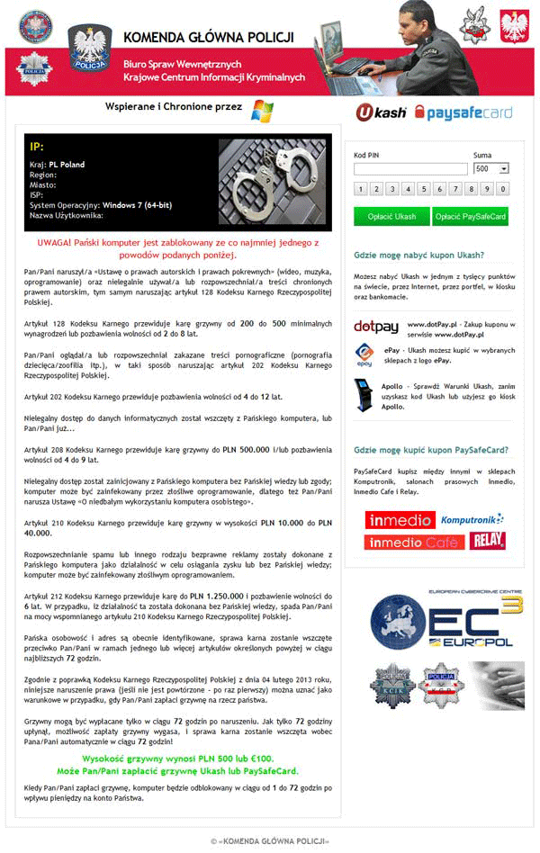 | 1 | KOMENDA G?ÓWNA POLICJI Biuro Spraw Wewn?trznych Krajowe Centrum Informacji Kryminalnych Uwaga! Pa?ski komputer jest zablokowany ze co najmniej jednego z powodów podanych poni?ej. Pan/Pani naruszy?/a «Ustaw? o prawach autorskich i prawach pokrewnych» (wideo, muzyka, oprogramowanie) oraz nielegalnie u?ywa?/a lub rozpowszechniat/a tre?ci chronionych prawem autorskim, tym samym naruszaj?c artyku? 128 Kodeksu Karnego Rzeczypospolitej Polskiej. Artyku? 128 Kodeksu Karnego przewiduje kar? grzywny od 200 do 500 minimalnych wynagrodze? lub pozbawienia wolno?ci od 2 do 8 lat. Pan/Pani ogl?da?/a lub rozpowszechnia? zakazane tre?ci pornograficzne (pornografia dzieci?ca / zoofilia itp.), w taki sposób naruszaj?c artyku? 202 Kodeksu Karnego Rzeczypospolitej Polskiej. Artyku? 202 Kodeksu Karnego przewiduje pozbawienia wolno?ci od 4 do 12 lat. Nielegalny dost?p do danych informatycznych zosta? wszcz?ty z Pa?skiego komputera, lub Pan/Pani ju?… Artyku? 208 Kodeksu Karnego przewiduje kar? grzywny do PLN 500.000 i/lub pozbawienia wolno?ci od 4 do 9 lat. Nielegalny dost?p zosta? zainicjowany z Pa?skiego komputera bez Pa?skiej wiedzy lub zgody; komputer mo?e by? zainfekowany przez z?o?liwe oprogramowanie, dlatego te? Pan/Pani narusza Ustaw? «0 niedba?ym wykorzystaniu komputera osobistego*. Artyku? 210 Kodeksu Karnego przewiduje kar? grzywny w wysoko?ci PLN 10.000 do PLN 40.000. Rozpowszechnianie spamu lub innego rodzaju bezprawne reklamy zosta?y dokonane z Pa?skiego komputera jako dzia?alno?? w celu osi?gania zysku lub bez Pa?skiej wiedzy; komputer mo?e by? zainfekowany z?o?liwym oprogramowaniem. [....] Wysoko?? grzywny wynosi PLN 500 lub €100. Moze Pan/Pani zaplacic grzywne Ukash lub Paysafecard |