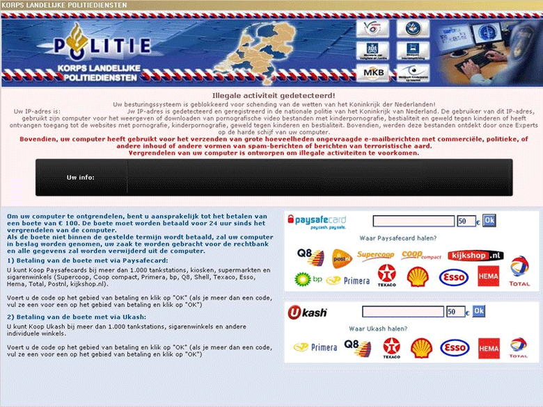 As the bottom line to its harassment, Korps Landelijke Politiediensten Ransomware requests that you pay a fee through Ukash or Paysafecard to atone for your crimes. However, SpywareRemove.com malware experts note that no negative consequences will befall you for ignoring this fake fee, and recommend ignoring any other bluffs about legal punishment from Korps Landelijke Politiediensten Ransomware prior to removing it from your computer.