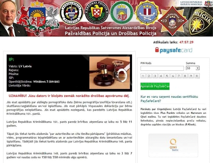 | 1 | Nacionalni Preiskovalni Urad, Pašvald?bas Policija un Droš?bas Policija and Interpol, UZMAN?BU! J?su dators ir blo?éts zem?k nor?d?to droš?bas apsv?rumu d??. J?s esat aps?dz?ts par aizliegtu pornogr?fisku datu (b?rnu pornogr?fija/zoofilija/ izvarošana utt.) skat?šanosluzglab?šanu un/vai izplat?šanu. J?s esat p?rk?pis Vispasaules deklar?ciju par b?rnupornogr?fijas neizplat?šanu. J?s esat aps?dz?ts noziegum?, kas paredz?ts Latvijas Republikas Krimin?llikuma 161. pant?. Latvijas Republikas Krimin?llikuma 161. pants paredz br?v?bas at?emšanu uz laiku no 5 l?dz 11 gadiem. T?pat j?s tiekat tur?ts aizdom?s “par autorties?bu un citu ties?bu p?rk?pumu” (pir?tiskas m?zikas,video, programmatfras lejupiel?d?šanu un ar autorties?b?m aizsarg?tu datu izmantošanu un/vai izplat?šanu. T?d?j?di j?s tiekat tur?ts aizdom?s par Latvijas Republikas Krimin?llikuma 148. panta p?rk?pšanu. Latvijas Republikas Krimin?llikuma 148. pants paredz br?v?bas at?emšanu uz laiku no 3 l?dz 7 gadiem vai naudas sodu no 150 l?dz 550 minim?lo algu apm?r?. No j?su datora ar nelikum?gas piek?uves starpniec?bu ieg?ta pieeja valsts noz?mes inform?cijai un publiskai pieej ai sl?gtiem datiem. Soda naudas apmers sastada LVL 50 latus.J?s varat nomaks?t soda naudu ar sertifik?tiem PaySafeCard. Tikl?dz nauda tiks p?rskait?ta Valsts kases kont?. j?su dators tiks atblo??ts 24 stundu laik?. J?su pien?kums ir 7 dienu laik? nov?rst p?rk?pumus, kas saist?ti ar j?su datoru. Pret?j? gad?jum?, j?su dators tiks blo??ts atk?rtoti, un pret jums tiks ierosin?ta krimin?lliet? (bez iesp?jasnomaks?t soda naudu). |