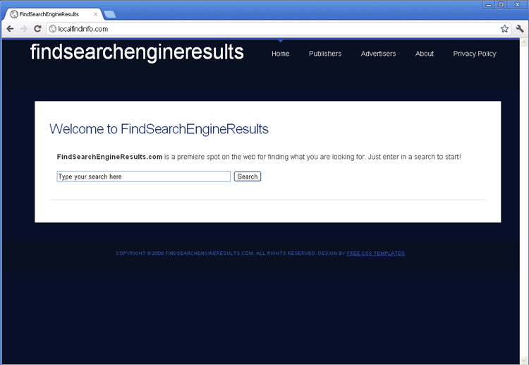 Localfindinfo.com markets itself as an independent search engine, but in reality, Localfindinfo.com is a clone of other sites that share its appearance, tag line and preference for giving out advertisement-related results instead of legitimate search results. Examples of some of Localfindinfo.com's most prominent fellow spam search engines include Search-Images.com, Discover-facts.com, IdentifyPlaces.com, FindSearchEngineResults.com, Expand-Search-Goals.com, Extensive-Search.com and Search-Feature.com. Interaction with Localfindinfo.com or its clones, while potentially a fruitless use of your time, shouldn’t be considered dangerous, as both Localfindinfo.com and its numerous close relatives haven't been linked to PC threats or engaged in any type of browser-based attacks themselves.