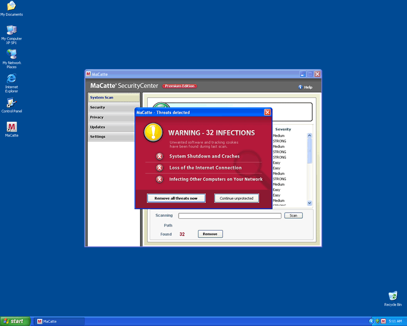 MaCatte Antivirus 2009 is a rogue anti-spyware program that attempts to impersonate the McAfee security application. MaCatte Antivirus 2009 once installed, MaCatte Antivirus 2009 is able to display fake parasite results in system scans that it supposedly conducts. The threats detected by MaCatte Antivirus 2009 do not actually exist.