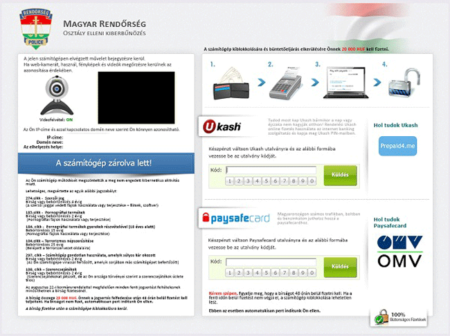 The Magyar Rendőrség Virus or Hungarian Police Virus, rather than being sent by the police, is a ransomware Trojan that's designed for the extortion of money from frightened and deceived victims. One of many examples of the Reveton family of ransomware Trojan-based PC threats that are focusing on most of Europe, the Magyar Rendőrség Virus displays a borderless pop-up window that threatens you with jail time for various PC-based crimes. However, the Magyar Rendőrség Virus's way out of this dire fate – paying a fee through a retailer-purchasable voucher – is merely Magyar Rendőrség Virus's way of stuffing the pockets of its criminal coders. If you see a Magyar Rendőrség Virus pop-up on your screen, SpywareRemove.com malware researchers can't recommend a better solution than disabling the Magyar Rendőrség Virus with typical anti-malware techniques and then scanning your PC with appropriate anti-malware programs to delete your Magyar Rendőrség Virus harmlessly.