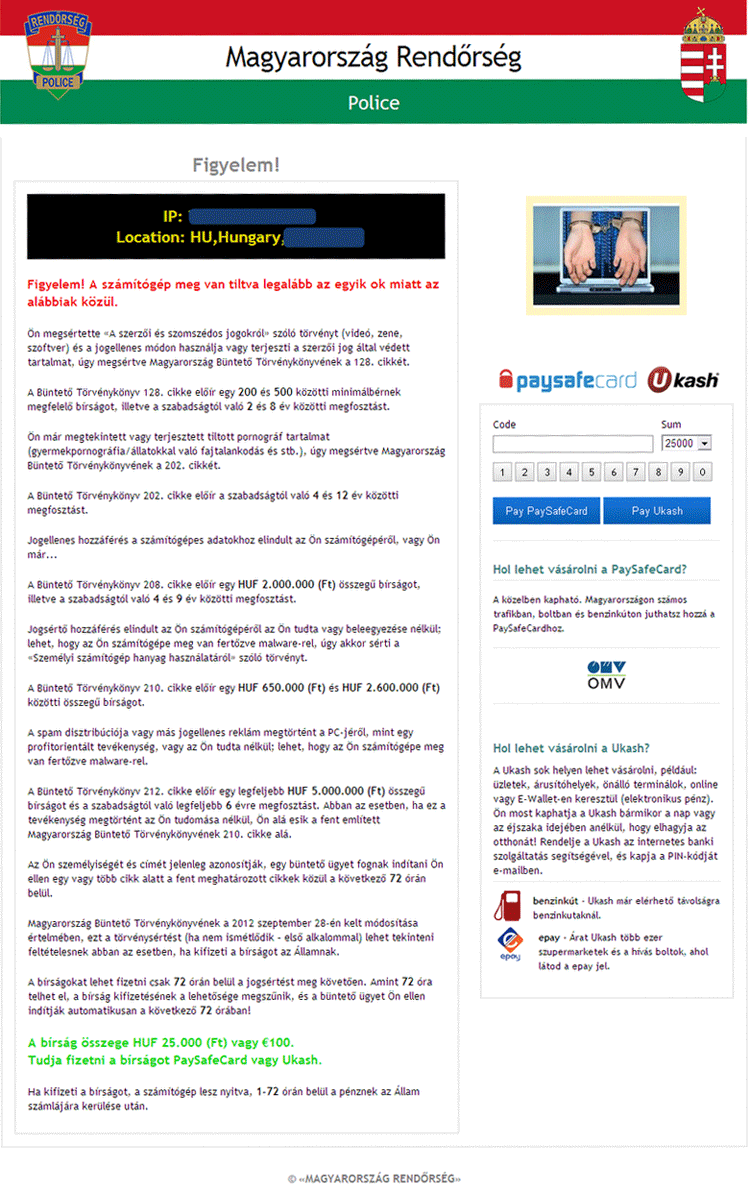 Like other members of the Reveton family, the Magyar Rendőrség Virus displays a regional coat of arms (for Hungary, in its case), your IP address and your webcam input if any is available. Other Reveton Trojans will use details specific to other countries; examples that SpywareRemove.com malware analysts have identified lately include France's France Ministère de l'Intérieur Virus, Turkey's Türk Polisi Virus, Slovakia's Slovenská Polícia VirusSlovenská Polícia Virus, Austria's Polizei Control Department Virus, Finland's Poliisi Tietoverkkorikos Tutkinnan Yksikkö Ransomware, Slovenia's Polizia Slovena Ransomware and Romania's Politia Romana Virus.
