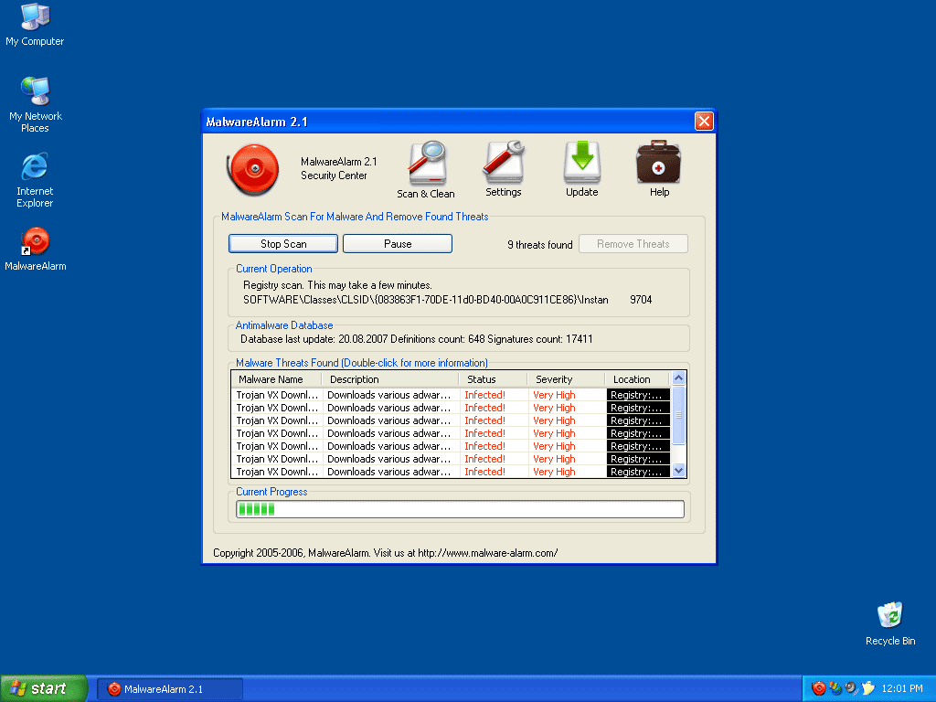 MalwareAlarm is a fake anti-spyware program that is often downloaded and installed without user knowledge or consent by a Trojan or through browser security holes. MalwareAlarm launches on Windows startup and may generate large numbers of popup adverts. MalwareAlarm will also display notifications of imaginary security risks in its attempts to get the user to purchase the full version. MalwareAlarm program can be extremely difficult to remove manually, and will continue to try to recreate itself.