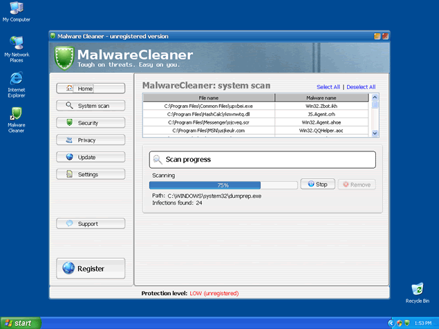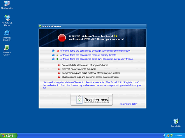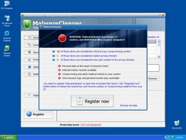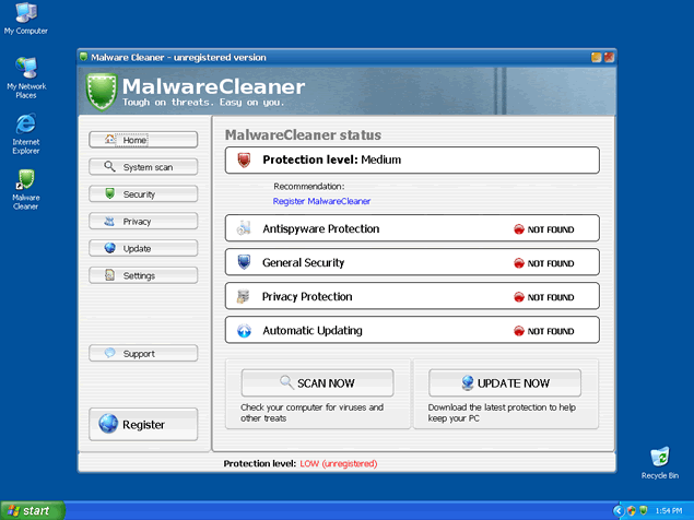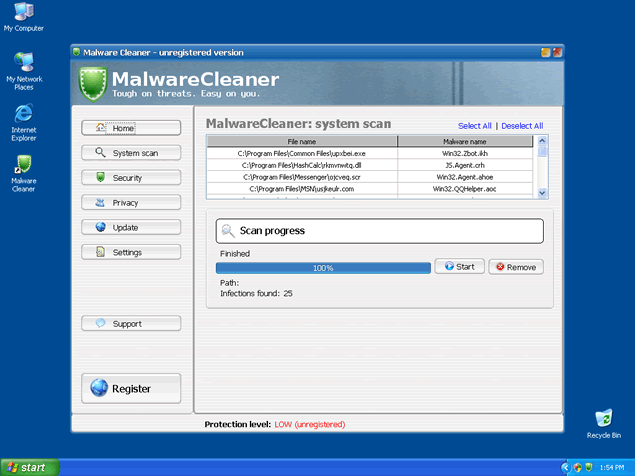 In order to remove these imaginary threats, Malware Cleaner will offer its "licensed" version. All links provided by Malware Cleaner will most likely redirect you to Malware Cleaner's website or other corrupt websites that distribute Malware Cleaner as a legitimate software. Moreover, Malware Cleaner is able to emulate a computer system scan and display a list of spyware infections as a result.