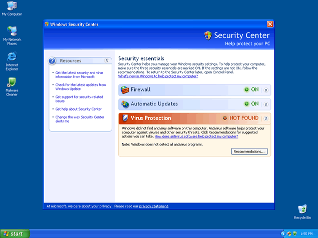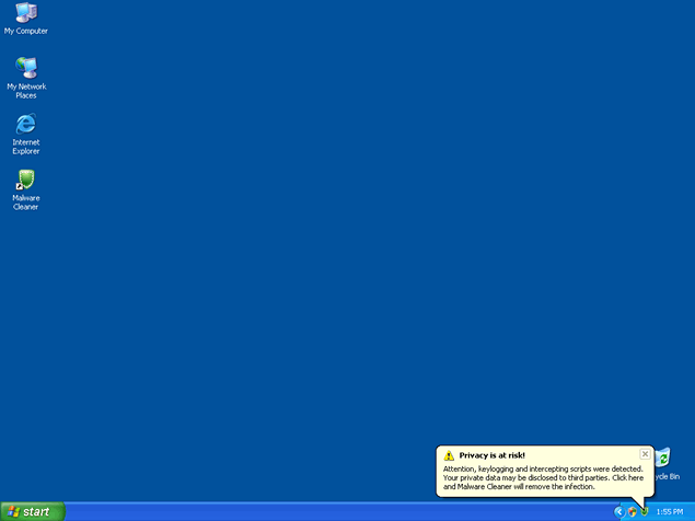 Once MalwareCleaner is installed, it will issue fake popups and system notification messages stating that your computer system is flooded with spyware. Malware Cleaner also displays a window that steals the interface from Microsoft's Windows Security Center. All the links from the fake "Windows Security Center" window point to Malware Cleaner's homepage.
