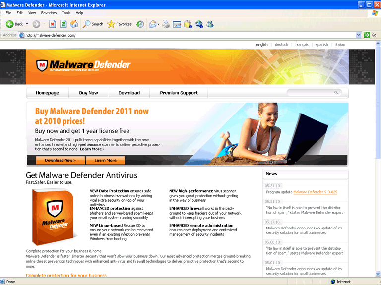 Malware-defender.com is a fake anti-virus program website that steals money and credit card information, by selling scamware like Malware Defender, which is also sold under the name Malware Defender 2011. Even though malware-defender.com proudly announces that its product is still available 'at 2010 prices,' Malware Defender is a recent rogue anti-virus program that's a direct clone from other rogue AV products like Eclipse Antivirus and Unlimited Defender. You can expect to see no real virus-detection or removal features on Malware Defender application, and playing host to such malicious programs may result in problems accessing your real anti-malware applications. In all cases, the best thing for your PC and bank account is to avoid giving malware-defender.com the credit card information that malware-defender.com so desperately craves and instead use a good anti-malware program to remove all malware-defender.com-related infections.