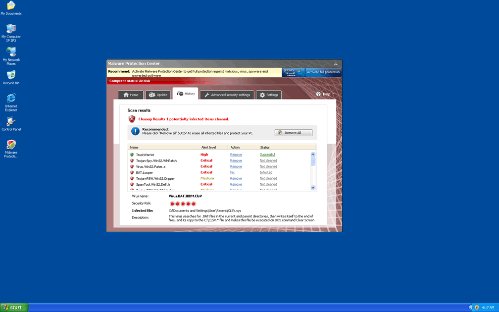 - The creation of junk files (often in .dll or .sys formats) that Malware Protection Center accuses of being the result of unrelated infections, such as Trojans.