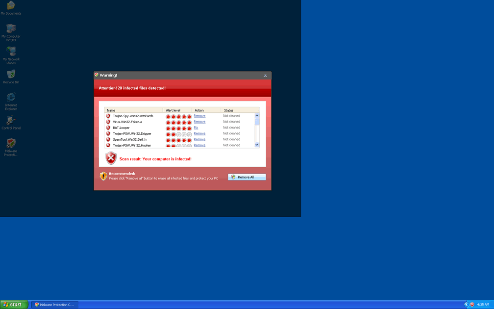 Malware Protection Center is a fake anti-spyware application that has no genuine ability to find or delete PC threats from your computer. In spite of this, Malware Protection Center will continue to pretend that Malware Protection Center has such functions by creating fraudulent warning messages and scanner results. SpywareRemove.com malware researchers recommend that you delete Malware Protection Center using a genuine anti-malware tool whenever possible, since there's no benefit to keeping Malware Protection Center around and because Malware Protection Center's presence may also hamper your security by blocking system utilities or hijacking your browser. Under no circumstances should you ever heed Malware Protection Center's advice to purchase its full version or take its recommendations regarding threats to your PC that are, in all likelihood, nonexistent.