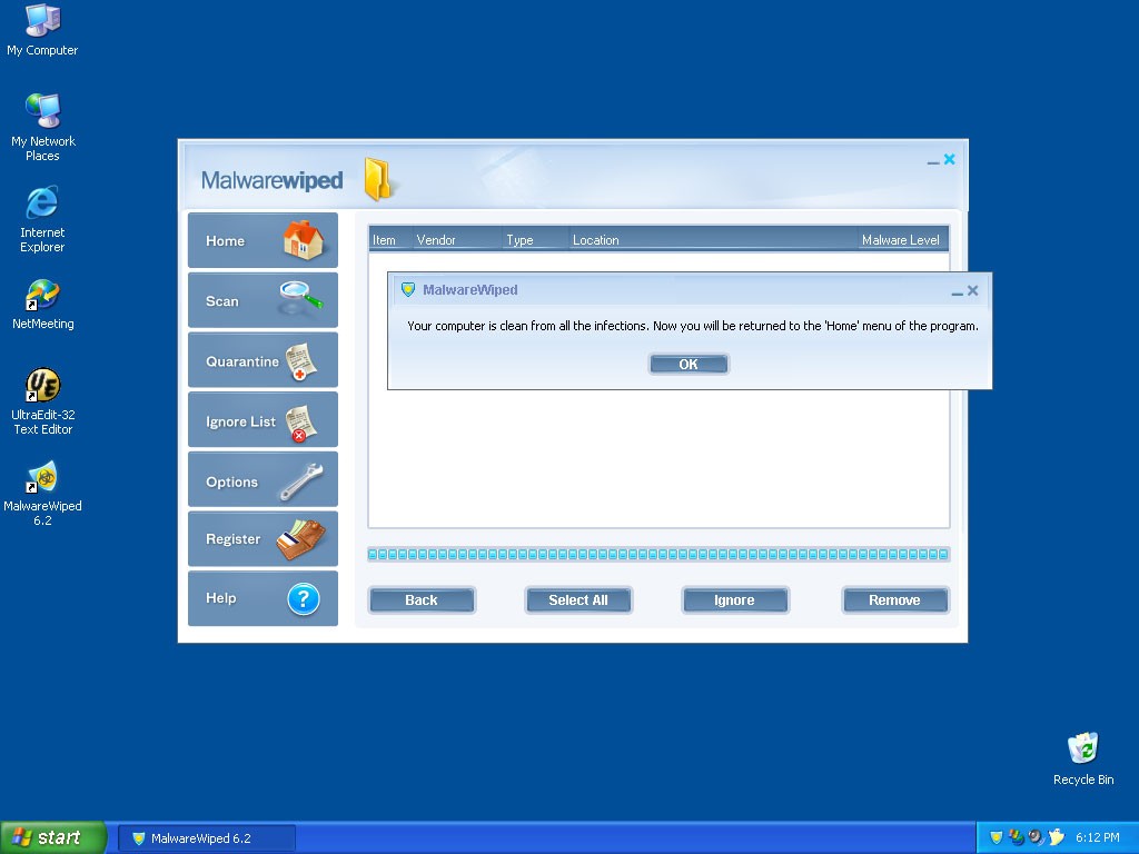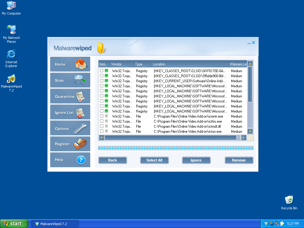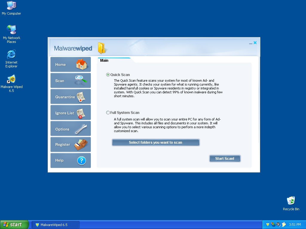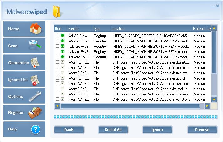 MalwareWiped is a rogue anti-spyware program that may secretly install itself on your computer without your consent. MalwareWiped is known to be distributed through Trojan programs and browser security holes. MalwareWiped may be related to SpyAxe, another rogue anti-spyware program.