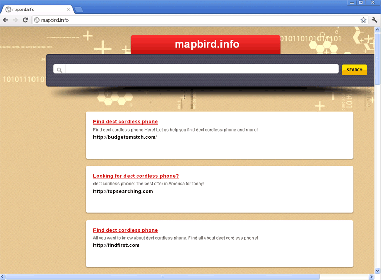 Mapbird.info is a clone of the decidedly imitable Ninjaa.info and similar sites that portray themselves as legitimate search engines. While search results from Mapbird.info may, upon occasion, provide what you're looking for, SpywareRemove.com malware experts recommend that you be cautious around content that's provided by Mapbird.info due to its connection with browser hijackers and blacklisted hosts. Under most circumstances, you'll find yourself at Mapbird.info after your PC has been infected by a PC threat that redirects your browser to Mapbird.info without permission – the closest thing to marketing that Mapbird.info appears to have. If you see symptoms of browser hijacks that involve Mapbird.info or identical sites, scanning your PC with a dependable anti-malware program should be able to remove the relevant PC threat, although the recent nature of these attacks may also require you to update your scanner before it can do this.