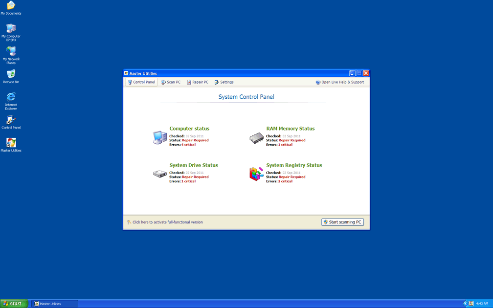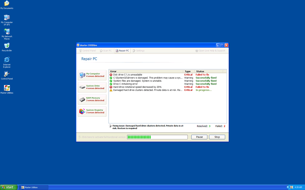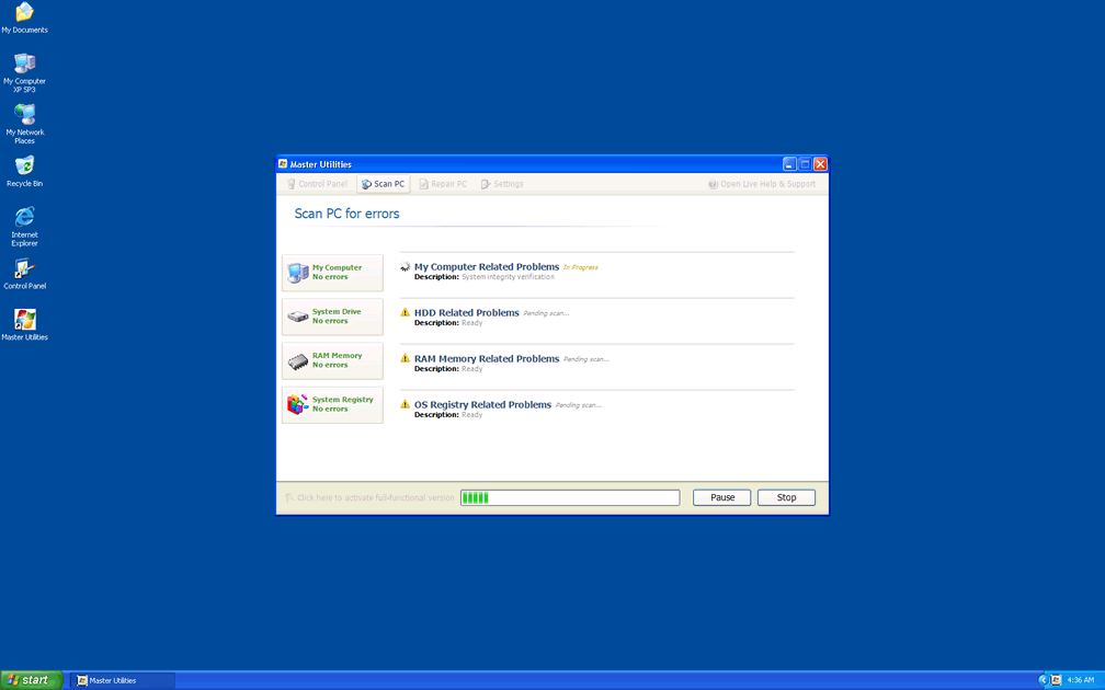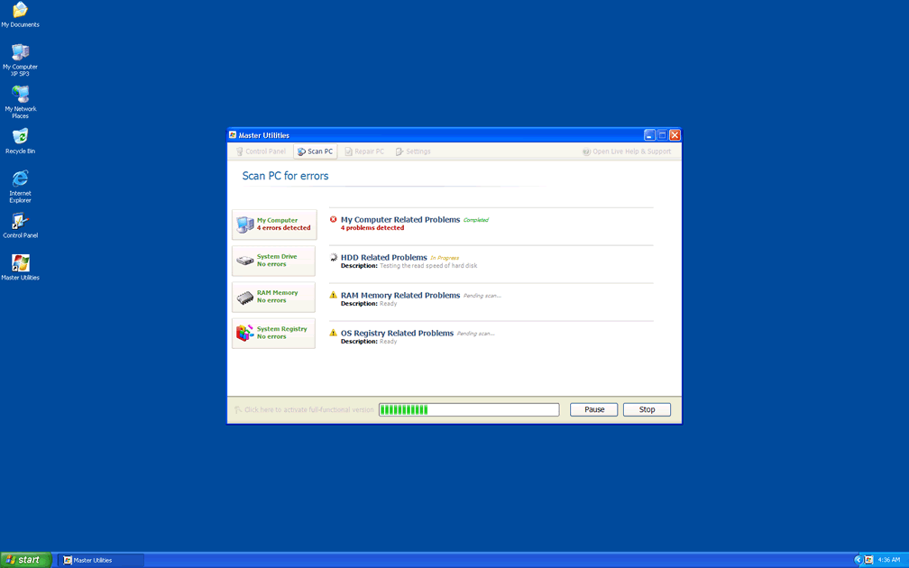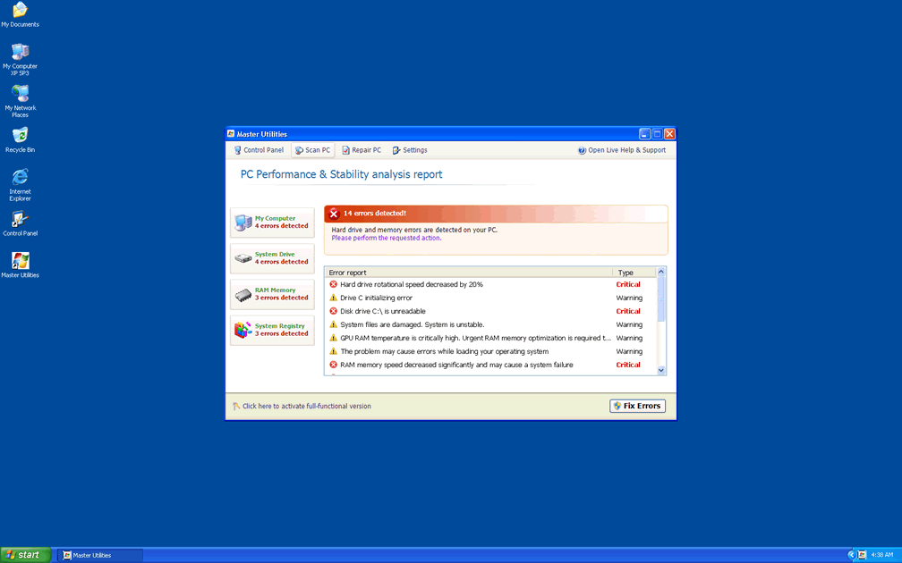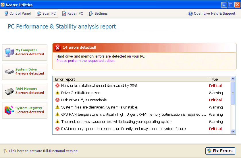 Since SpywareRemove.com malware researchers have found that many of these errors may try to redirect you to a Master Utilities website, you should be especially careful to avoid purchasing a Master Utilities activation code or other forms of fraudulent software, such as Memory Optimizer, Memory Scan, HDD Tools, HDD Scan, Windows 7 Restore or Windows Tool, all of which are clones of Master Utilities.