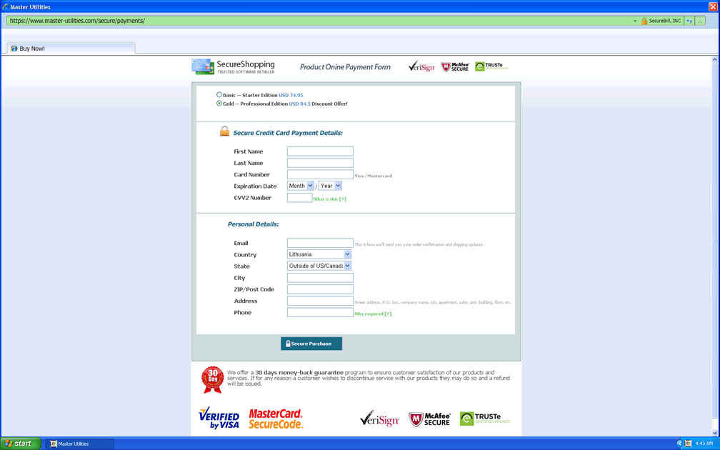 If necessary, you can use the freely-available code '1203978628012489708290478989147' to activate Master Utilities and make Master Utilities shut down its attacks under the assumption that you've 'purchased' Master Utilities. An actual purchase of Master Utilities and its fake services is, of course, never recommended.
