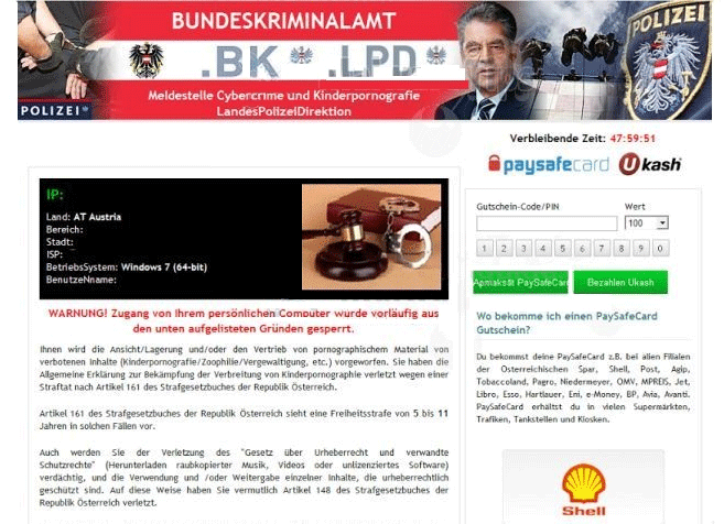 The 'Medestelle Cybercrime und Kinderpornografie' Ransomware's attacks specialize in displaying modified browser pop-ups that can't be closed and, not-so-coincidentally, blocks your access to other programs, along with the rest of the Windows interface. This fake alert claims to have locked your computer as an action of a sub-division of Austria's police force, but the 'Medestelle Cybercrime und Kinderpornografie' Ransomware is not affiliated with the Austrian police and always will attack any computer that the 'Medestelle Cybercrime und Kinderpornografie' Ransomware manages to infect, regardless of that computer's Internet history. The 'Medestelle Cybercrime und Kinderpornografie' Ransomware cannot detect child pornography, copyright infringement or other misuses of your PC and, contrary to the warning message in its pop-up, does not target illegally-used PCs specifically.