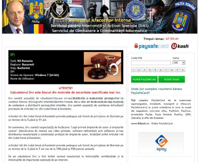 While claiming to act with the authority of such organizations as Romania's Special Operations Forces (the SIAS), the 'Ministerul Afacerilor Interne' Ransomware actually is a malicious and illegal program designed to extort money under fraudulent pretenses. Installations for the 'Ministerul Afacerilor Interne' Ransomware usually are handled by websites hosting drive-by-download exploits or, in some cases, other Trojans that install additional malware without requiring your consent. Despite its stealth-based means of installation, the 'Ministerul Afacerilor Interne' Ransomware usually will be identifiable in short order as a result of its pop-up attack.