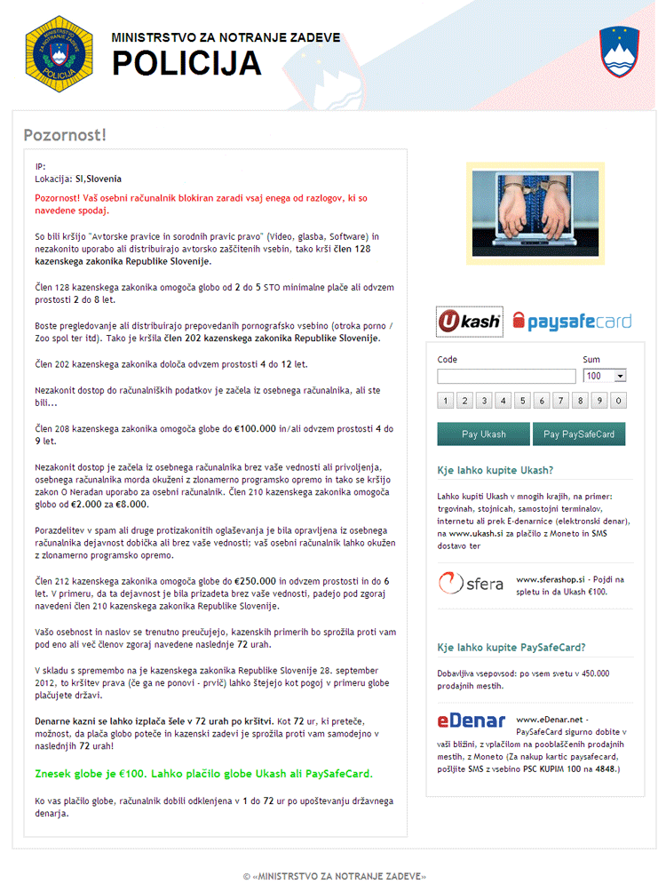 | 1 | Pozornost! Vaš osebni ra?unalnik blokiran zaradi vsaj enega od razlogov, ki so navedene spodaj. So bili kršijo “Avtorke pravice in sorodnih pravi pravo” (Video, glasba, Software) in nezakonito uporabo ali distribuirajo avtorko zaš?itenih vsebin, tako krši ?len 128 kazenskega zakonika Republike Slovenije. |