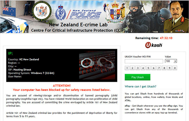 | 1 | New Zealand E-Crime Lab New Zealand Police Centre for Infrastructure Protection (CCIP) Interpol Attention! Your computer has been blocked for safety reasons listed below. You are accused of viewing/storage and/or dissemination of banned pornography (child pornography/zoophilia/rape etc). You have violated World Declaration on non-proliferation of child pornography. You are accused of committing the crime envisaged by Article 161 of New Zealand criminal law. Article 161 of New Zealand criminal law provides for the punishment of deprivation of liberty for terms from 5 to 11 years. Also, you are suspected of violation of "Copyright and Related rights Law" (downloading of pirated music, video, warez) and of use use and/or dissemination of copyrighted content. Thus, you are suspected of violation of Article 148 of New Zealand Criminal Law. Article 148 of New Zealand criminal law provides for the punishment of deprivation of liberty for terms from 3 to 7 years or 150 to 550 basic amounts fine. It was from your computer, that unauthorized access had been stolen to information of State importance and to data closed for public Internet access. . <more fake legal threats> . The penalty set must be paid in course of 48 hours as of the breach. On expiration of the term, 48 hours that follow will be used for automatic collection of data on yourself and your misconduct, and criminal case will be opened against you. Amount of fine is NZD $100. You can pay a fine Ukash vouchers. As soon as the money arrives to the Treasury account, your computer will be unblocked in course of 24 hours. Then in 7 day term you should remedy the breaches associated with your computer. Otherwise your computer will be blocked up again and criminal case will be opened against yourself (with no option to pay fine). |