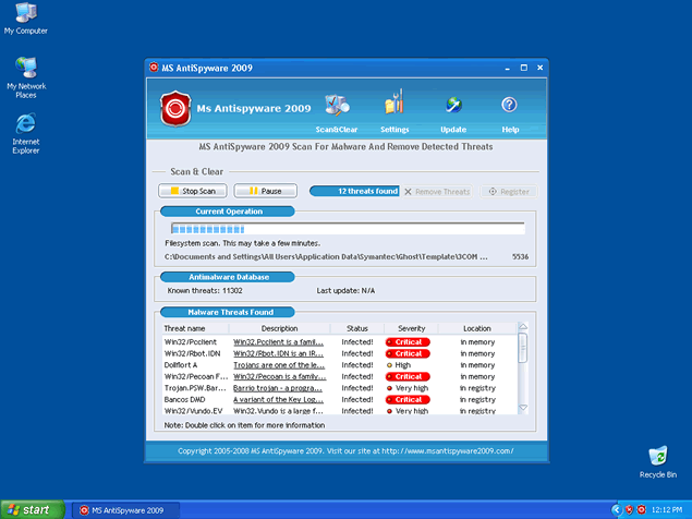 Once MS AntiSpyware 2009's trial version is installed, it will run a fake system scan to generate a list of spyware results that are supposedly found in your system. Along with this scan, popups and fake system alert messages may appear to "inform" you about your supposed infections.