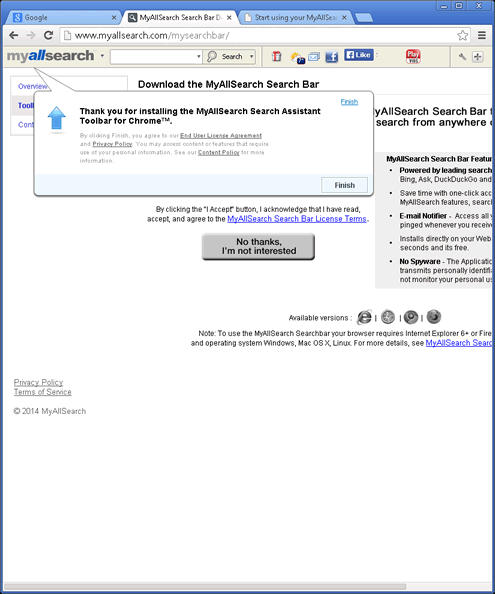 MyAllSearch.com is a search engine that Internet users have been getting redirected to no matter what link they click on their Google search results. Because browser hijackers may also include other functions and will attack all web browsers through changes to your Windows settings, it's recommended that you use dependable anti-malware software to remove them as soon as you notice their symptoms – which, in addition to redirects to unwanted websites, may also encompass pop-ups, website-blocking attacks and generally-worsened browser performance.