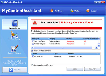 MyContentAssistant is a rogue PC repair program that is often downloaded and installed by Trojans or through browser security holes. MyContentAssistant launches on Windows startup and will overwhelm you with fake alerts or pop-ups. MyContentAssistant is a malicious program that issues fake warnings in an attempt to trick you into buying MyContentAssistant's full commercial version. It is extremely difficult to remove MyContentAssistant manually because this program may continue to try to recreate itself.