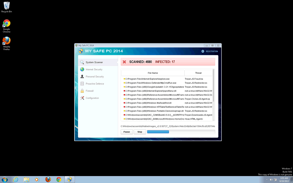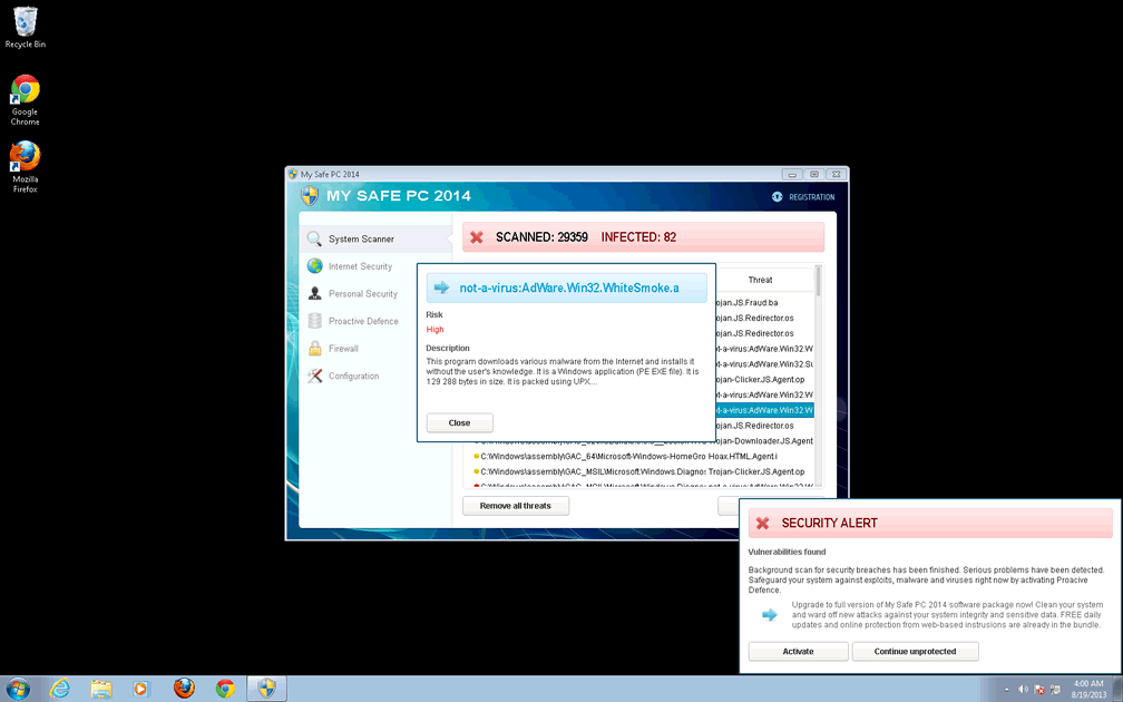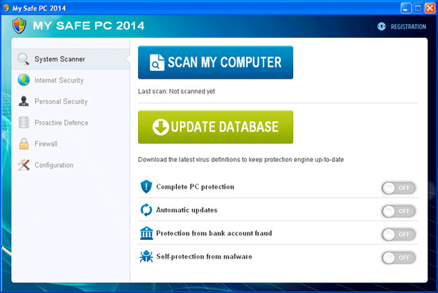 - In accordance with its disguise as an anti-malware product, My Safe PC 2014 also will display pop-ups and system scans that are pre-configured to always 'detect' PC threats on your computer even if My Safe PC 2014 is the only malware present. These deliberately misleading attacks are intended to frighten you into spending money on My Safe PC 2014's fraudulent software registration, which supposedly will disinfect your computer.