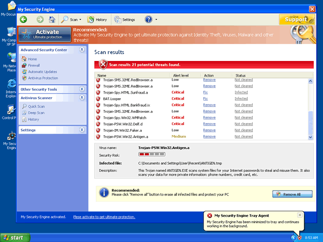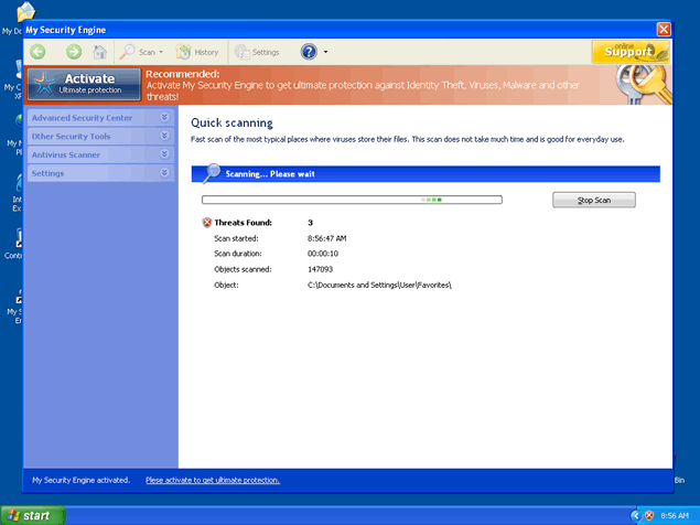 My Security Engine (MySecurityEngine) is a rogue anti-spyware program that displays fake security notifications in order to trick you into purchasing their full version. MySecurityEngine may change your desktop settings to issue fake warning messages, and hijack the web browser to redirect you to unwanted websites. My Security Engine installs malicious files and automatically downloads itself onto your computer, which makes MySecurityEngine difficult to remove.