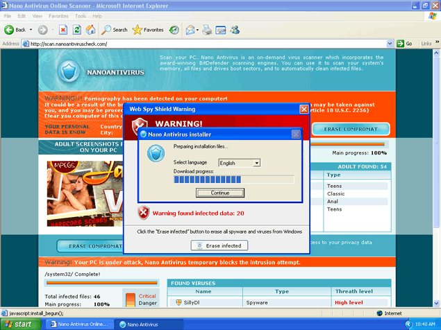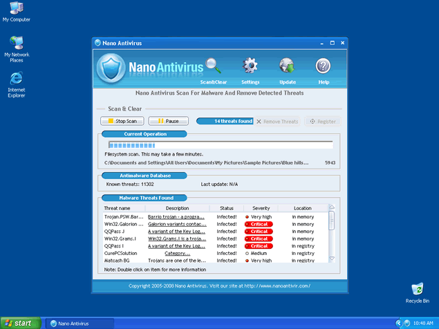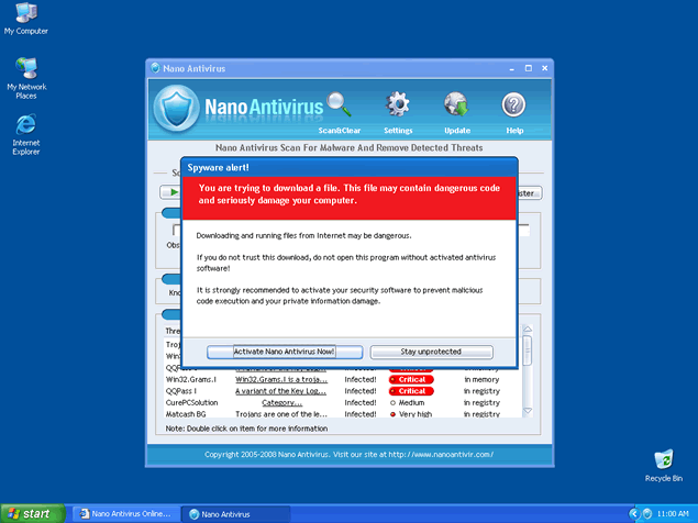 Nano Antivirus, also known as NanoAntivirus, is a rogue anti-spyware program and clone of AntiSpyware Pro XP. Nano Antivirus may be installed onto your computer by Trojans found bundled on corrupt shareware programs or you may have manually downloaded the program from a malware website. Once installed, you'll receive numerous fake system alerts or security alerts notifying you about supposed spyware infections. In order to remove these imaginary threats, you'll be urged to purchase Nano Antivirus's "licensed" program.