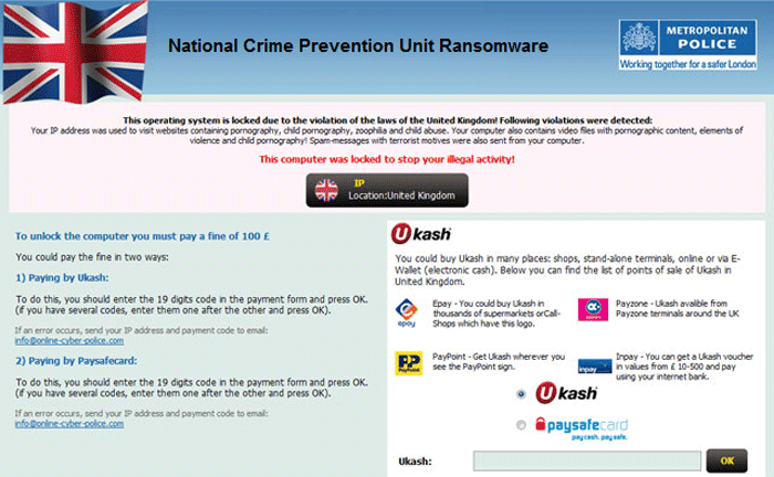 SpywareRemove.com malware experts must emphasize that the 'National Crime Prevention Unit' Ransomware attacks any PC that the 'National Crime Prevention Unit' Ransomware can infect and isn't even remotely related to the British government. The 'National Crime Prevention Unit' Ransomware's pop-up warning may appear to be monitoring your location, but this simple trick just is a case of its detecting your IP address and drawing its geographical assumptions from that point – a scam that most other types of Police Ransomware Trojans also have used. The 'National Crime Prevention Unit' Ransomware's pop-up also asks you to pay a fine through either Ukash or Paysafecard which, of course, will not do anything to stop the 'National Crime Prevention Unit' Ransomware's attacks or otherwise help your computer.