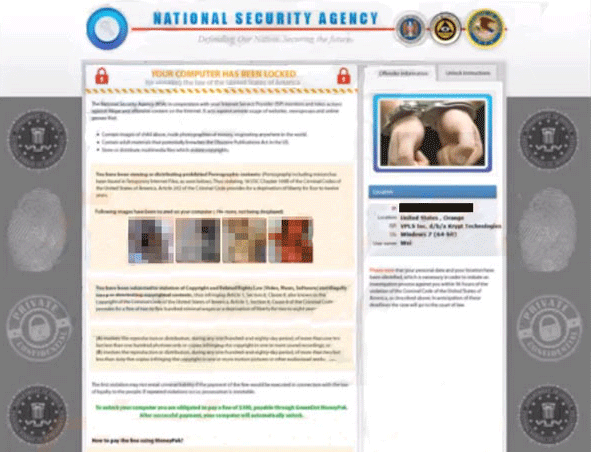 The 'National Security Agency' Ransomware isn't an actual program used by the NSA for penalizing cyber criminals, although its pop-up does its best to portray the 'National Security Agency' Ransomware as one. Rather, the 'National Security Agency' Ransomware is a Trojan that uses the common ploy of claiming that its victim has been involved in embarrassing crimes like viewing child pornography as an excuse to lock their computers and demand money in exchange for letting them have everything restored. Lending credence to the 'National Security Agency' Ransomware's hoax is its display of actual child pornography-related images combined with some stock legal text and basic information about your location (the latter of which is easily detectable by unsafe software that doesn't have access to any government databases).