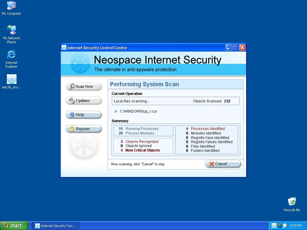 Neospace is a rogue PC security application that bothers Internet users with its fake warnings regarding computer security issues. Neospace tries to push users to pay for its full version. Neospace installs on a computer system with the help of Trojans or through browser security holes. Neospace may also display additional annoying pop-up ads that will disrupt Internet browsing activities. It is recommended that you uninstall Neospace from your computer immediately. Although you can manually uninstall Neospace through the Add/Remove Program Tool, there might still be some traces of Neospace files left on your computer which can recreate the spyware after reboot.
