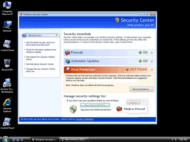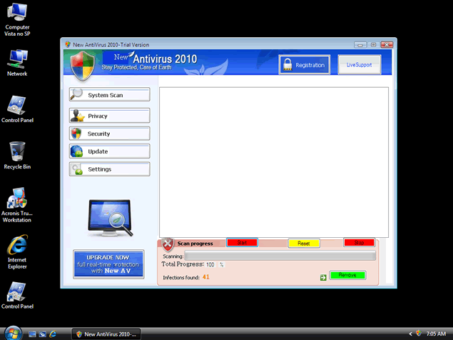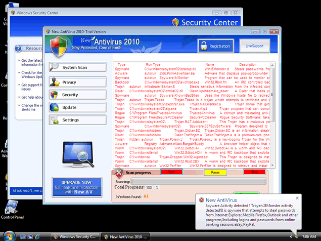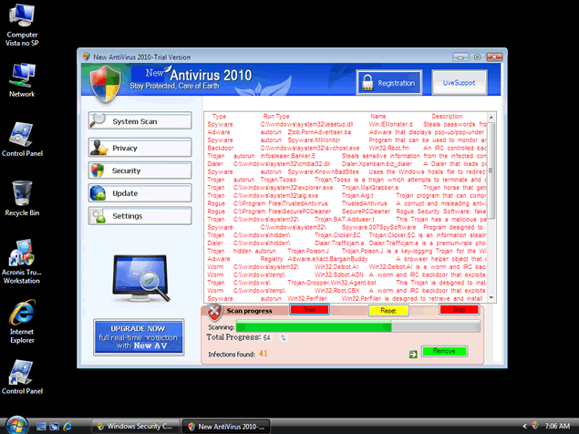 New Antivirus 2010 is not a trusted security program. New Antivirus 2010 does not have the ability to detect or remove computer parasites. Detection and removal of New Antivirus 2010 is recommended to be performed with a spyware removal tool to reduce the risk of damages to system files.