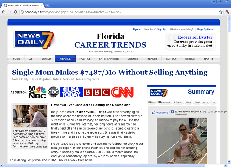 Newsdaily7.tv looks like a site that offers too-good-to-be-true job offers and related news, but Newsdaily7.tv isn't linked with any sort of genuine company or career offerings. Instead, Newsdaily7.tv simply uses this farce to gather up e-mail addresses and other forms of personal information, which can then be sold to third parties or exploited by criminals. Even visiting Newsdaily7.tv without any intention of interacting with Newsdaily7.tv will subject your browser to a range of pop-ups that contain advertisements, phishing attacks and scams. Newsdaily7.tv's identical twin, Newsdaily7.com, can be considered just as bad Newsdaily7.tv itself, in all respects.