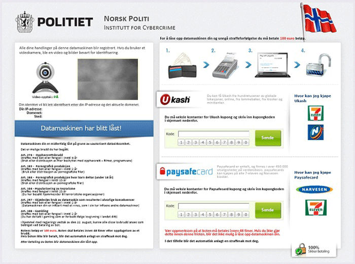 | 1 | Institutt for Cybercrime Politiet Alle dine handlinger på denne datamaskinen blir registrert. Hvis du bruker et videokamera, ble en video og bilder bevart for identifisering. Datamaskinen har blitt last! Datamaskinen din er midlertidig list på grunn av uautorisert datavirksomhet. Det er mulige brudd du har begått: Art. 274 – Opphavsrettsbrudd t Straffes med bot eller fengsel i inntil 4 ar (Bruk eller distribusjon av filer beskyttet med opphavsrett – filmer, programvare) Art. 183 – Pornografisk produksjon t Straffes med bot eller fengsel i inntil 2 ar (Bruk eller distribusjon av pornografiske filer) Art. 184 – Pornografisk produksjon hvor barn deltar (under 18 år) Straffes med fengsel i inntil 15 ar (Bruk eller distribusjon av pornografiske filer) Art. 104 – Popularisering av ter/orisme Straffes med fengsel i inntil 25 ar (Du har besøkt hjemmesider til terroristiske organisasjoner) Art. 297 – Skjødesløs bruk av datamaskin som resulterte i alvorlige konsekvenser Straffes med bot eller fengsel i inntil 2 ar (Datamaskinen din er infisert med et virus, som i sin tur infisere andre datamaskiner) Art. 108 – Gambling Straffes med bot el er fengsel i inntil 2 ar (Du har deltatt i gamling som er forbudt ifølge lovgivning i landet ditt) i hjemmel med regjerings vedtak av den 22. august, kunne alle disse lovbrudd anses som betinget ved betaling av bot. Botens beløp er 100 euro. Boten skal betales innen 48 timer etter oppdagelsen av et brudd. Hvis boten ikke blir betalt, blir det automatisk anlagt en straffesak mot deg. Etter betaling av boten blir datamaskinen din last opp. |