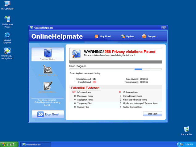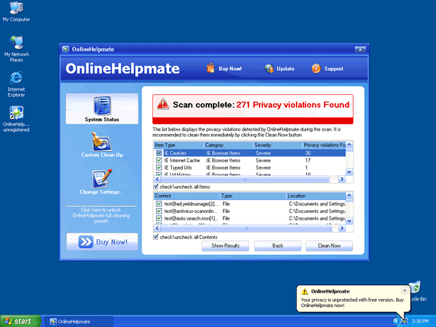 Online Helpmate is a fake anti-spyware program that is often downloaded by a Trojan infection or browser security hole. Online Helpmate is no help at all when it comes to removing spyware parasites from your computer. After Online Helpmate is installed on your computer it attempts to get you to spend your money on the full Online Helpmate program through popups and alert messages. Online Helpmate can be very difficult to remove manually.
