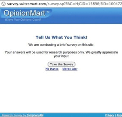Opinion Mart Survey is a browser extension that enters the vulnerable computer without a PC users permission and knowledge. Opinion Mart Survey occurs on the targeted computer system as a pop-up message asking to take a brief survey. The PC user may think it's just an ordinary survey that he/she may be asked to take from time to time. However, Opinion Mart Survey is categorized as a potentially unwanted program as it can lead to some annoying actions on the infected computer. Opinion Mart Survey is spread to victimized PCs using deceptive methods. Opinion Mart Survey can be added to the hijacked web browser while installing a variety of freeware from the Internet. Computer users can evade Opinion Mart Survey if they pay attention to the installation processes of what they are downloading. Usually, computer users are able to see if Opinion Mart Survey involves any additional applications. If the PC user has an option to choose what components to download, they should always deselect unidentified ones as they can violate the victim's security and privacy.