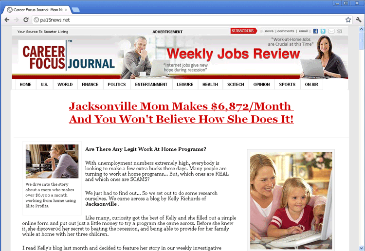 Pa15news.net is a fake news website that uses its intriguing offers of 'work from home' jobs to phish for personal information. In addition to being a harmful website by itself, Pa15news.net is also advertised by browser hijackers that obligate your web browser to load Pa15news.net even if you're attempting to visit unrelated sites. Pa15news.net has also been associated with 'spam' and may be promoted via links from mass-mailed e-mail and other common forms of junk messages. SpywareRemove.com malware researchers recommend that you resolve browser redirects to Pa15news.net by scanning your PC with suitable anti-malware programs to delete the associated browser hijacker, and avoid giving any personal information to Pa15news.net, which isn't guaranteed to refrain from abusing it for personal profit.